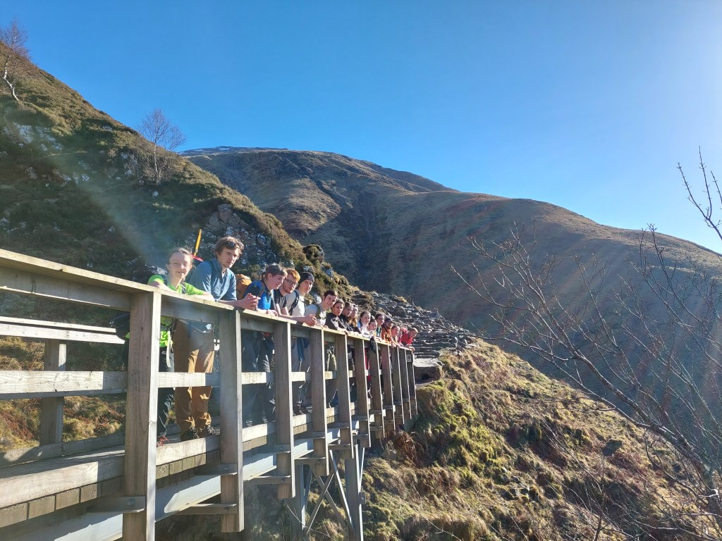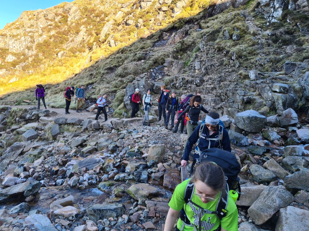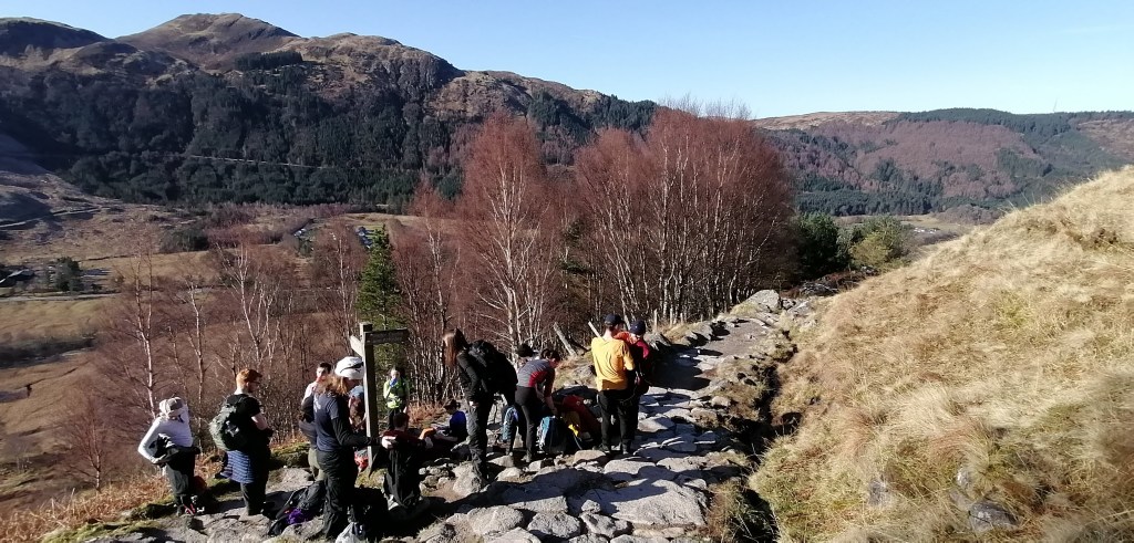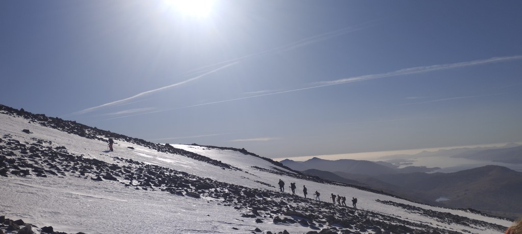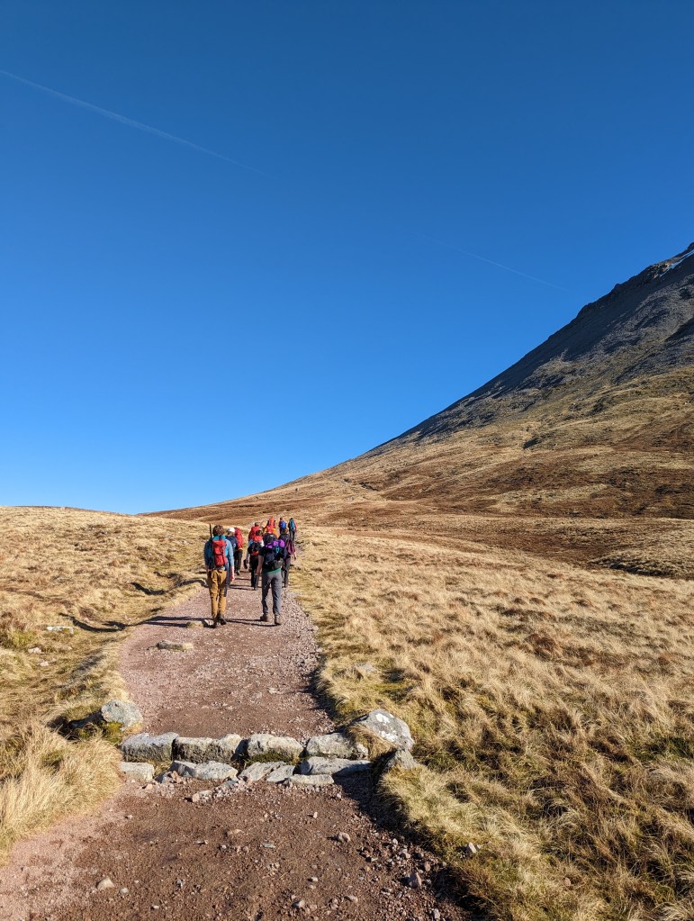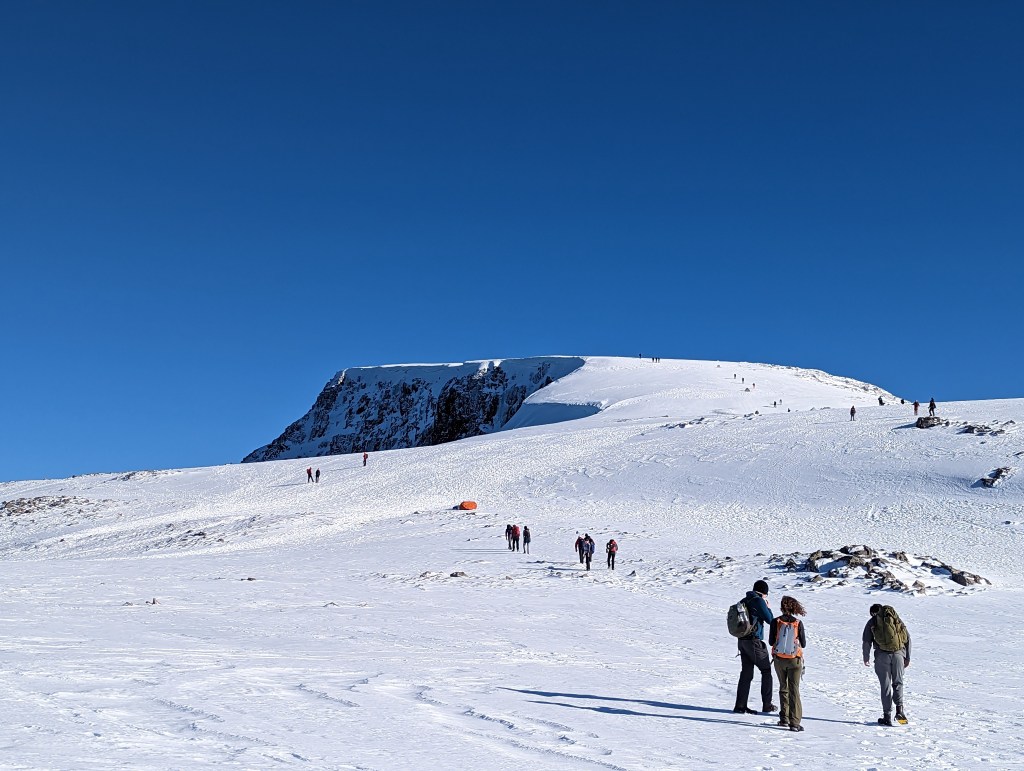 We arrived at the base of Ben Nevis with perfect conditions – sunny, clear and no wind at all. We packed our microspikes, split into two groups and set off!