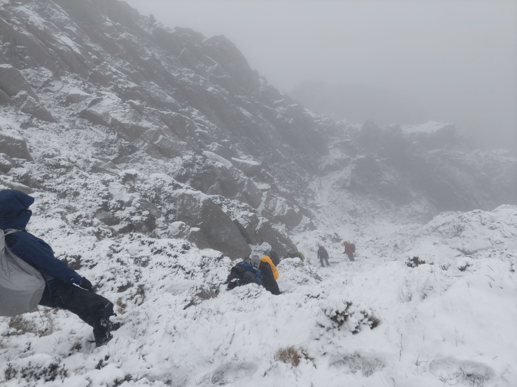 Waking to a beautiful sunrise with views of the snowy peaks we eagerly set off to explore the snow on Saturday morning. Dropping one group at Pen Y Pas, despite Matthew initially going to the wrong carpark, to climb Snowdon (Yr Wyddfa) then to descend through the ice to Llanberis Meanwhile the rest of the group travelled to Llyn Ogwen and climbed the wonderful Tryfan, one of the best mountains in the country. Setting off from the lay-by near Gwern Goch Uchaf farm we then ascended past Little Tryfan where some friendly climbers wished us well on our way from half way up the slab. Before continuing over the grass and ice up to the gully that gives access to the main path up the North side of the mountain. After encountering some goats which Jake insisted were sheep we continued higher enjoying the scrambles with Jacob finding a couple of oprional fun routes up the rock which were thoroughly enjoyed by all. It then started to snow and after a brief stop near the cannon rock to put on microspikes we continued up towards the summit before contouring round to the east enjoying some nice icy and snowy scrambles up towards the false summit at the North end of the summit ridge where we had a quick bite to eat in the lee of the rock to stay out of the wind before scrambling over the boulderfield up to the summit of Tryfan (914m). The descent was just as fun with lots of nice snow and scrambling as well as a large amount of snowball fights. After reaching Bwlch Tryfan we descended north past Llyn Bochlwyd and then down past some beautiful waterfalls where we enjoyed rock handholds to prevent slipping on the glistening ice. After we had dropped below the snowline it was plain sailing back to the vans in Llyn Ogwen, apart from Isaac stepping in an icy bog, and then a nice drive up over a snowy Pen Y Pas to have a hot drink and collect the rest of the group from Llanberis. On returning to the bunkhouse for warming showers a lovely, although rather late sausage casserole and mash wash cooked by committee and then some tired souls got an early night whilst others played games and sang songs into the early hours.