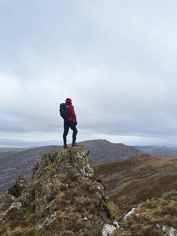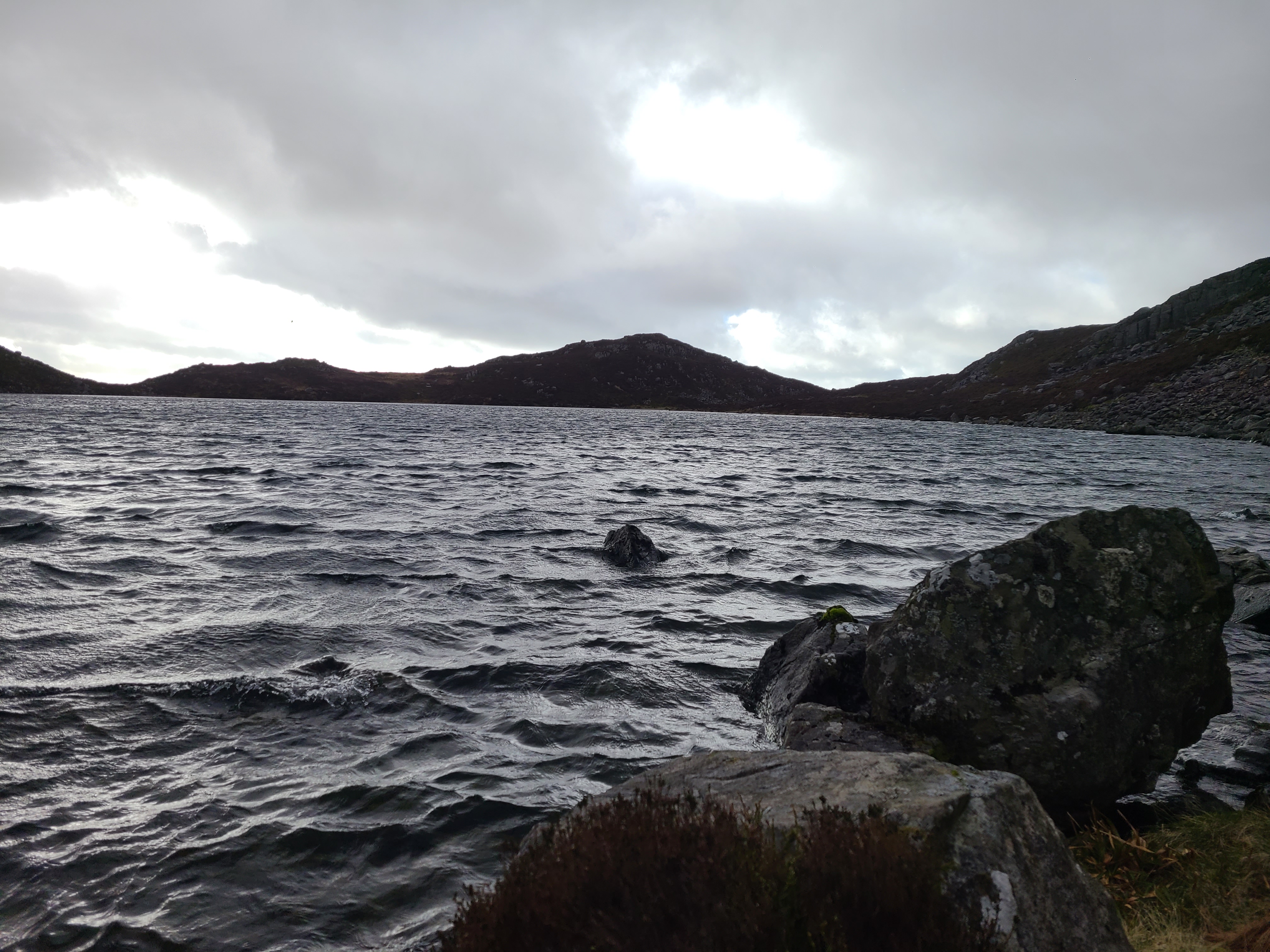 Saturday dawned with a biting dawn wind which luckily wasn’t complimented by the forecast showers. After freeing the vans from the soft grassy ground next to the bunkhouse the group travelled up to remote and beautiful Cwm Nantcol on the western side of the Rhinoggydd giving us a view of the rocky and heather covered terrain over which we would be traversing throughout the day. Setting out east along the wall to the bwlch avoiding the bogs and including some fun scrambles on the rocky boulders on the lower slopes to the south of Rhinog Fawr before returning to the bwlch for a spot of lunch before the ascent of Rhinog Fach. The steep slopes of Rhinog Fach provided a variety of route choices allowing some members the chance to scramble on some of the very grippy slabs whilst the rest followed the rocky path up. Upon gaining the ridge we were greeted with a strong breeze as well as encountering various different patches of frogspawn. Looking east from the summit views over Trawsfynydd reservoir, Arenig Fawr and Moel LLyfnant (Climbed on the December trip) and over to the Aran range which had a frosting of freshly fallen snow setting a wild scene coupled with the view west over the Irish Sea to the Llyn peninsula created a stunning panorama. After summiting Rhinog Fach (712m). We descended to the beautiful llyn Hywel over some boulders all the while battling the wind. Following the stream down from the llyn dropped us back out of the wind and back to the vans.