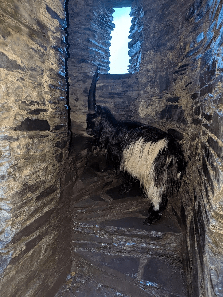 and back to the vans where we spent an enjoyable afternoon in Llanberis having hot chocolate before exploring Dolbardon castle where we found a goat guarding the staircase.
