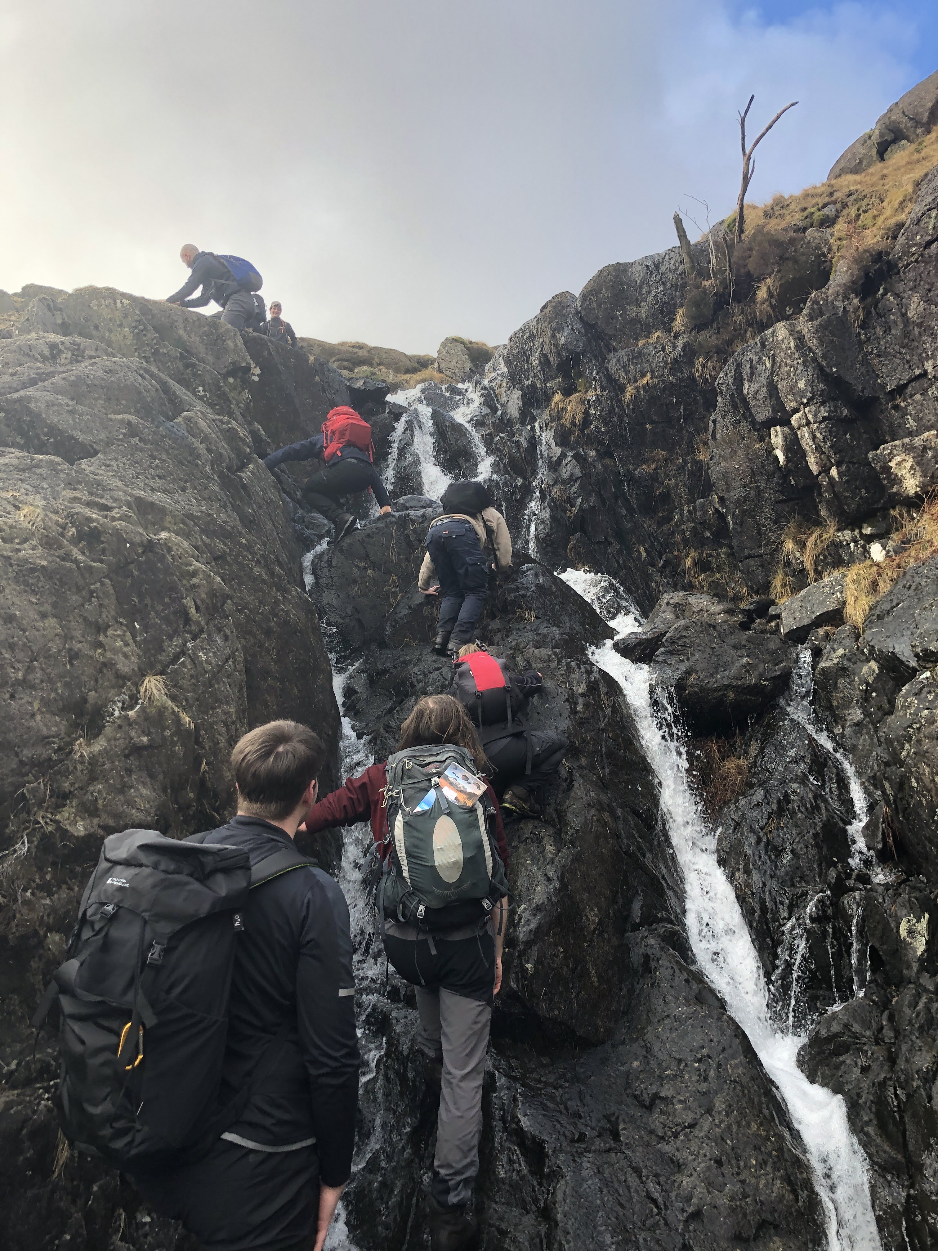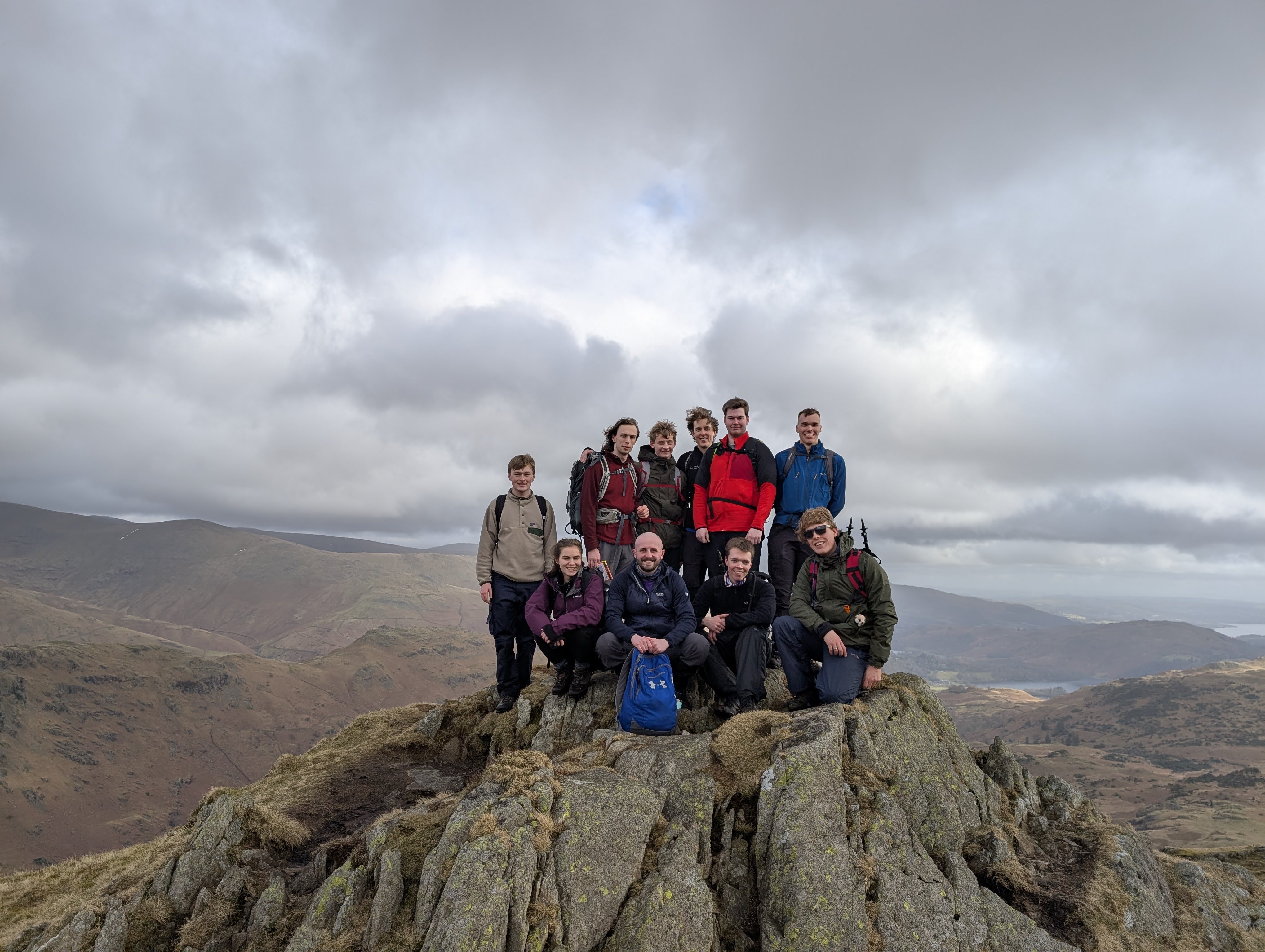 The technical route led by Laurie, Jacob and Josh headed up from Grasmere onto the eastern side of Sourmilk gill where we found some rock to scramble on as the water level was too high on the waterfall. We then continued up past the picturesque Easedale tarn expertly guided by Big Dom. After the tarn we had some fun scrambling up some of the waterfalls in the beck before a nice lunch stop below Belles knott. After lunch we scrambled up the ridge on Belles knott and then traversed across to Tarn crag (551m) before contouring round to Calf crag (537m) and descending over Gibsons Knott (422m) and onto the ‘Howitzer’ on Helm crag where we enjoyed the scramble up onto the true summit before descending rapidly back into Grasmere where some members managed to quickly purchase some of Grasmere’s famous gingerbread.