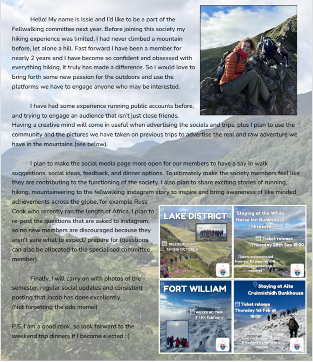 I plan to make the social media page more open for our members to have a say in walk suggestions, social ideas, feedback, and dinner options. To ultimately make the society members feel like they are contributing to the functioning of the society. I also plan to share exciting stories of running. hiking, mountaineering to the fellwalking instagram story to inspire and bring awareness of like minded achievements across the globe, for example Russ Cook who recently ran the length of Africa. I plan to re-post the questions that are asked to instagram. so no new members are discouraged because they aren’t sure what to expect/ prepare for (questions can also be allocated to the specialised committee member)