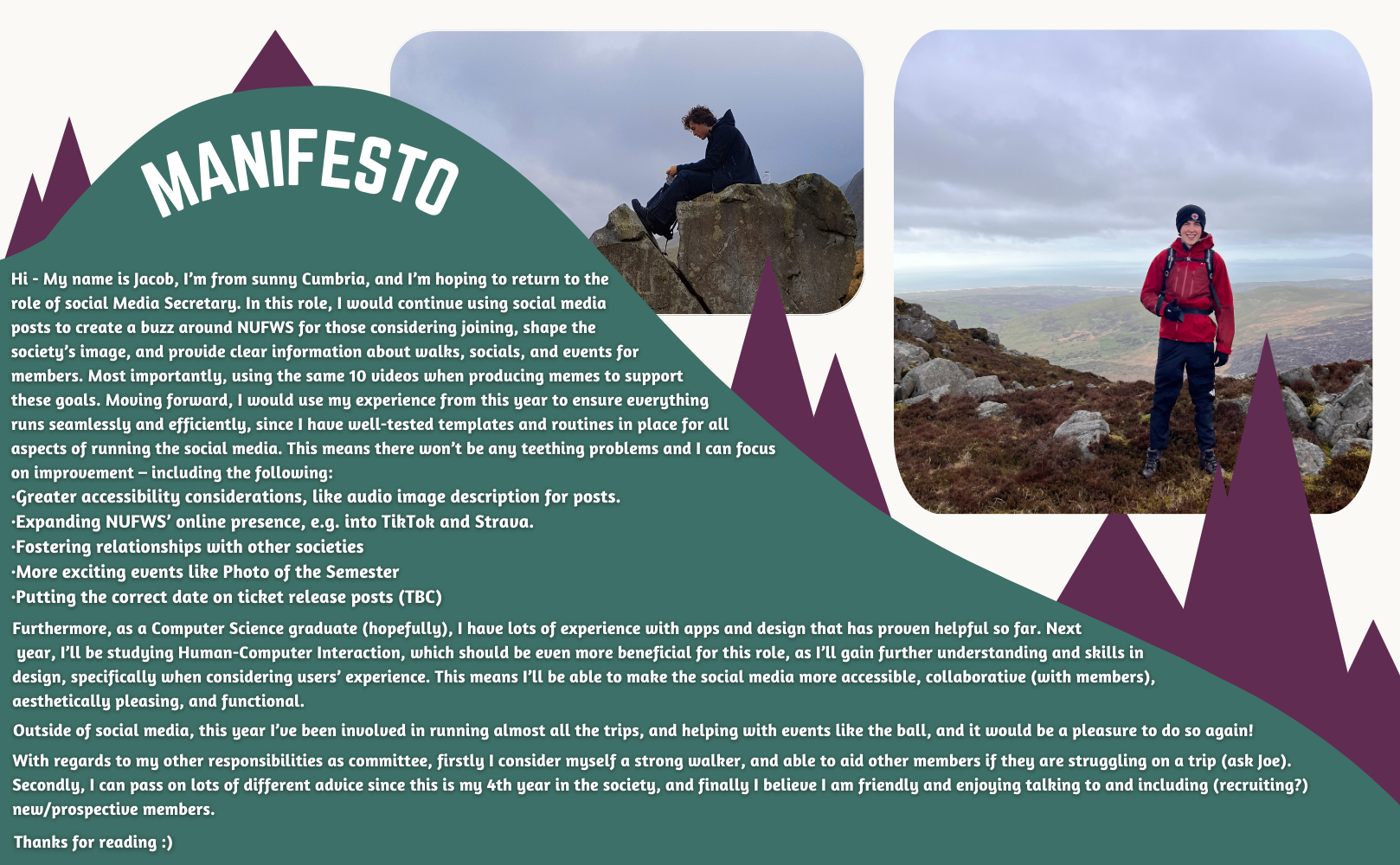 Hi – My name is Jacob, I’m from sunny Cumbria, and I’m hoping to return to the role of social Media Secretary. In this role, I would continue using social media posts to create a buzz around NUFWS for those considering joining, shape the societies image, and provide clear information about walks, socials, and events for members. Most importantly, using the same 10 videos when producing memes to support these goals. Moving forward, I would use my experience from this year to ensure everything runs seamlessly and efficiently, since I have well-tested templates and routines in place for all aspects of running the social media. This means there won’t be any teething problems and I can focus on improvement – including the following: